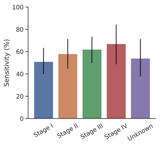At 95% specificity, the overall cancer sensitivity was 51% (CI: 40, 63) for stage I, 58% (CI: 45, 71) for stage II, 62% (CI: 50, 73) for stage III, and 67% (CI: 49, 84) for stage IV. Figure 3 shows the stage-specific sensitivities at 95% specificity (p = 0.5375) and Figure 4 shows the stage-specific areas under the curve.