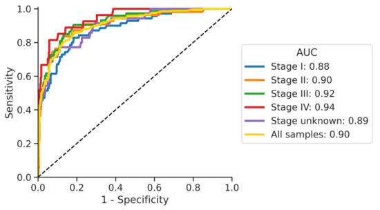 The area under the curve (AUC) for the cancer stages ranged from 0.88 for stage I to 0.94 for stage 4.