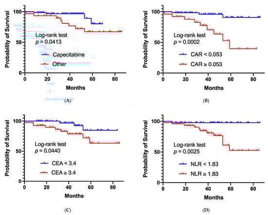 Overall survivals per each risk factor. Cumulative rates of overall survival for each risk factor, which were identified in univariate analyses using Cox regression analysis. Poor overall survival was significantly associated with no concurrent administration of capecitabine (A), high C-reactive-protein-to-albumin ratio (CAR) (B), high carcinoembryonic antigen (CEA) (C), and high neutrophil-to-lymphocyte ratio (NLR) (D).