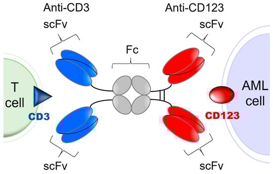 The α-chain of IL-3 receptor, also known as the CD123 antigen, is broadly expressed on a majority of leukemic blast cells [17,18,19,20]. CD123 is also expressed on clonogenic human AML blast cells, including the leukemia-initiating candidate leukemic stem cell populations capable of causing systemic leukemia in xenografted immunodeficient mice [17,18,19]. CD123 expression in AML is associated with both higher cell division activity and anti-apoptotic resistance at a cellular level and with a poor prognosis in clinical settings [17,21,22]. Several biotherapeutic agents targeting CD123 have been clinically evaluated against AML, including the CD123-directed recombinant human IL3 fusion toxin Tagraxofusp (SL-401); bispecific antibodies targeting CD123 antigen, such as bispecific T-cell engagers; dual affinity retargeting antibodies; bispecific killer cell engagers; and trispecific killer cell engagers [6,23,24,25,26,27,28,29,30].