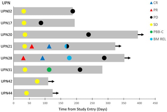 Swimmer plot of best overall responses of the eight-patient favorable response population of R/R AML patients. The onset and duration of SD, PR, CR, clearance of peripheral blasts (PBB-C), bone marrow relapse (BM REL), and onset of PD are indicated with specific symbols. Arrow: alive. See Table 4 and text for additional details.