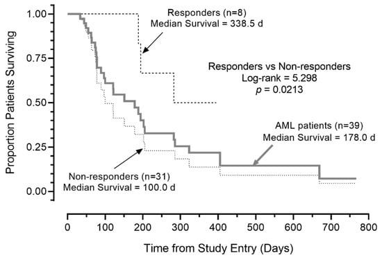 Notably, the median OS was >300 days for the eight R/R AML patients with a favorable response (prolonged SD and PRs/CRs). Five of the eight patients remained alive at 110, 124, 323, 352, and 395 days (Table 4, Figure 2). By contrast, the median OS for the remaining 31 AML patients in the intent to treat patient population (including five who were not evaluable for response) was 100 days (95% CI: 49.8–150.2), and 24 of 31 (77.4%) died. This difference in survival outcome of favorable responders vs. non-responders was statistically significant (log-rank χ2 = 5.298, p = 0.021; Figure 3). Likewise, the survival outcome of the favorable responders was significantly better than the OS of 26 non-responders who were evaluable for response determinations, whose median OS was 121.0 days (95% CI: 85.2–21.0 days) (log-rank χ2 = 5.120, p = 0.023).