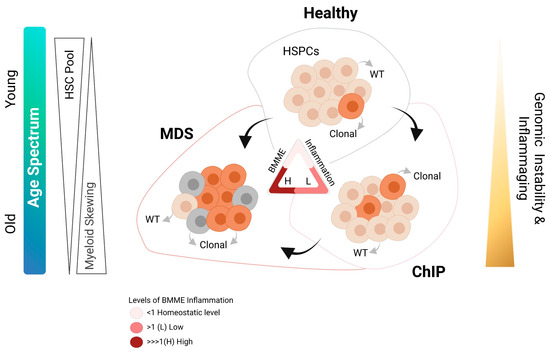 Schematic representation showing possible routes to MDS. Somatic mutations are known to occur in the hematopoietic stem cells (HSCs) during normal DNA replication. The basic premise of the long-standing idea is that a cell that is endowed with an advantageous mutation produces a progeny with increased fitness, which is selected and eventually flourishes. During the early stages of life, bone marrow inflammation is at homeostasis. However, with increasing age, genomic instability, age-related inflammation (Inflammaging) and external environmental cues, these ‘potent’ clones accumulate in the bone marrow, reaching a stage known as clonal hematopoiesis of indeterminate potential (ChIP). Notably, all hematopoiesis is clonally derived; however, malignancy can arise when the hematopoiesis become abnormal or marked by acquisition of additional mutations. Therefore, ChIP can turn to MDS once clinical manifestations of the disease are diagnosed. On the other hand, clonal selection and acquisition of certain mutations (with or without additional external factors) can directly result in switching from healthy stage to MDS. As the bone marrow ages, HSC pool becomes depleted with increasing inflammaging and these cells become skewed towards myeloid lineage. Illustration was created with BioRender.com (accessed on 28 June 2021).