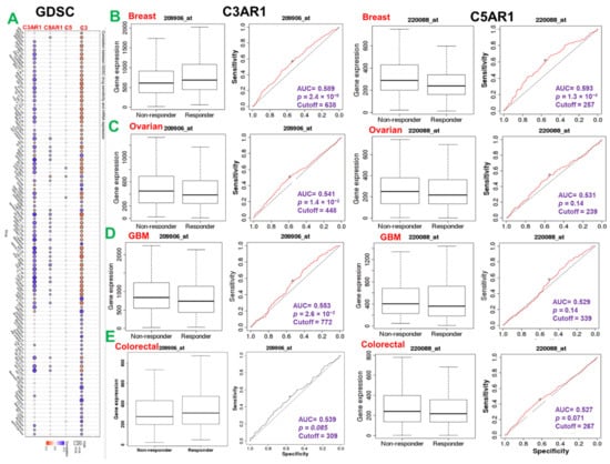 C3, C5, C3AR1, and C5AR1 expression is associated with response to chemotherapy in multiple cancer types. (A) Bubble plot of the correlation between GDSC drug sensitivity and mRNA expression of C3, C5, C5AR1, and C3AR1. The color from blue to red represents the correlation between mRNA expression and IC50. A positive correlation means that a gene with a high level of expression is resistant to the drug and vice versa. The bubble size positively correlates with the FDR significance. The black outline border indicates FDR < 0.05. The ROC plot of the association between C3AR1/C5ARI expression and the response to therapy of brain (D), breast (B), ovarian (C), and colorectal cancer (E).