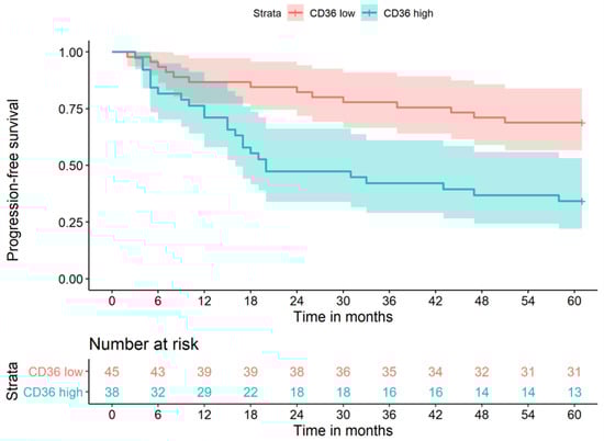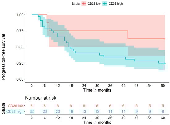 An analysis of progression-free survival of the N+ patients using the Kaplan–Meier method is shown in Figure 3. All patients included suffered from lymph node metastasis. Patients with high CD36 expression had lower probabilities of progression-free survival. Only eight patients with low CD36 expression suffered from lymph node metastasis compared to 32 with high CD36 expression. Due to (n = 8), a Cox regression was not performed. The p-value was 0.4 and thus the difference was not statistically significant. Higher case numbers are needed to make a statement, but at least a trend is apparent.