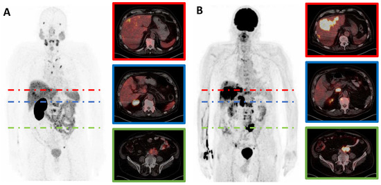 [68Ga]Ga-PSMA-11 (A) and [18F]FDG (B) PET/CT images of a representative mCRPC patient with hepatic (red) and lymphonodular (blue and green) mismatch lesions. Note: mCRPC, metastatic castration-resistant prostate cancer.