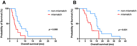 Kaplan–Meier curves for OS (A) from time point of combined [18F]FDG and [68Ga]Ga-PSMA-11 PET imaging and (B) from the start of [177Lu]Lu-PSMA-617 radioligand therapy, both stratified by mismatch (red) and non-mismatch (blue). Note: OS, overall survival.