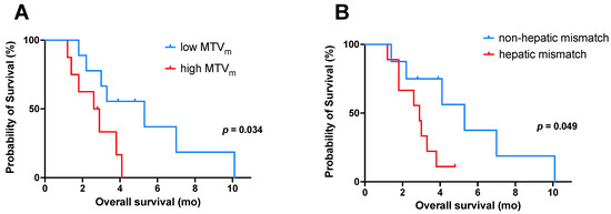 Kaplan–Meier curves for OS (from the time point of combined [18F]FDG and [68Ga]Ga-PSMA-11 PET imaging) in patients with mismatch findings (n = 17) stratified by (A) low/high MTVm (cut-off value: 74.4 mL), and (B) presence or absence of hepatic mismatch lesions. Note: OS, overall survival; MTVm, metabolic tumor volume of all mismatch lesions.