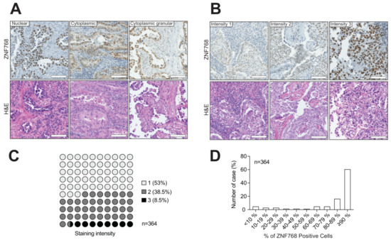 ZNF768 expression is often elevated in human LUAD. (A) Representative pictures of the different ZNF768 immunohistochemistry staining patterns in the tumors (nuclear–cytoplasmic-cytoplasmic granular) (magnification × 20, scale bar 100 µm). (B) Example of the three-pronged scoring system (intensity 1-intensity 2-intensity 3) (magnification × 20, scale bar 100 µm). (C,D) Distribution of the main staining intensity and the percentage of ZNF768 positive cells in the tumors of the cohort.