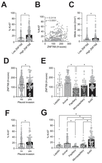 ZNF768 expression associates with proliferative clinicopathological features in LUAD. (A) Tumors were separated in high and low ZNF768 expressing groups based on the H-score of the tumor (low, ZNF768 H-score ≤ 130; high, ZNF768 H-score > 130). Difference in the Ki-67 percentage between high and low ZNF768 expressing groups. (B) Correlation between the ZNF768 H-score and the percentage of Ki-67 positive cells. (C) Difference in the mitotic score between high and low ZNF768 expressing groups. (D) Differential expression of ZNF768 in the tumors with pleural invasion. (E) ZNF768 expression in the different histological patterns of the tumors. (F) Differential percentage of Ki-67 positive cells in the tumors with pleural invasion. (G) Ki-67 percentage in the different histological patterns of the tumors. Significance was determined by Spearman’s correlation, t-tests (2 variables) or ANOVAs (< 2 variables) depending on the nature of the factors (* p < 0.05).