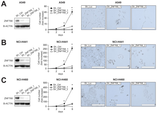 ZNF768 depletion impairs proliferation of various lung cancer cell lines. (A) A549 cells, (B) NCI-H441 and (C) NCI-H460 cells were transduced with lentivirus expressing shRNA targeting ZNF768. Cells were selected with puromycin and protein were extracted, or cells were plated and counted every two days. Pictures were taken on the last day of counting. Representative pictures are shown. Western blot analyses were performed to confirm ZNF768 depletion. This experiment was performed at least 2 times for each cell types and cell counts were done in triplicates. Significance was determined by Two-way ANOVA (* p < 0.05 versus control).