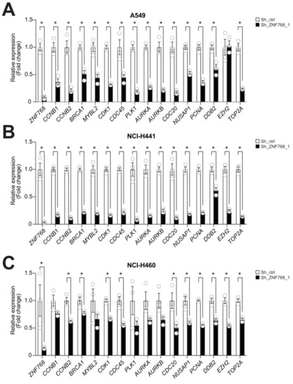 ZNF768 is a transcription factor that has been shown to regulate a wide variety of genes in a cell-specific manner by binding to mammalian-wide interspersed repeats (MIRs) in vitro [14]. It was recently shown that the transcriptional signature associated with ZNF768 depletion was enriched in pathways regulating cell cycle progression [13]. Based on the impact of ZNF768 depletion on lung cancer cells, we aimed to determine whether ZNF768 depletion also altered the expression of genes involved in cell cycle progression. To do so, ZNF768 was knockdown in A549, NCI-H441 and NCI-H460 cells and RNA was extracted following selection. Several genes controlling the cell cycle (e.g., CDK1, MYBL2, CCNB1, CCNB2), chromosome segregation (e.g., SMC4, NUSAP1, AURKA, AURKB, PLK1, CDC20), genome replication (e.g., PCNA, CDC45, TOP2A) and stability (e.g., BRCA1, DDB2, EZH2, MYBL2, TOP2A) were next measured. These genes were selected based on previous transcriptomics assays performed following the knockdown of ZNF768 in U87 cells [13] or the overexpression of a dominant negative ZNF768 in U2OS cells [14]. Some of these genes were also shown to be regulated following ZNF768 depletion in several cell lines in the iLincs resource, a publicly available databank providing the expression profile of almost 1000 genes (L1000 assay) in response to various perturbagens in multiple cell lines [15]. As shown in Figure 4, we found that ZNF768 depletion was associated with a severe decrease in the expression proliferative genes (Figure 4A–C). Although the global effect on gene expression was consistent, the extent of repression was slightly different in the three lines, with the highest repression in NCI-H441 cells and the lowest repression in NCI-H460 cells. Overall, these results support a strong connection between ZNF768 expression and proliferation in lung cancer cell lines.