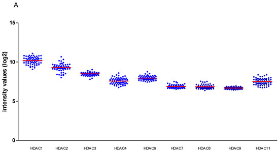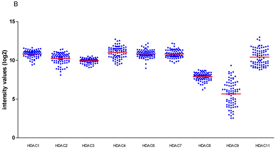 When we looked at the mRNA levels of the different HDACs, we noticed a moderate variable expression in the Leiden cohort (Figure 1A) as well as in the TCGA panel (Figure 1B). We already knew that expression of some of the HDACs was related to the tumour’s chromosome 3 status, but now also investigated the possible association between HDACs and patient (age and gender) and tumor characteristics, such as cell type, tumor location (involvement of the ciliary body), and tumor size (indicated as cTNM stage) in the Leiden cohort of 64 cases as well as in the TCGA cohort (mRNA expression) of 80 cases. BAP1 expression was determined by immunohistochemical staining in 55 cases of the Leiden cohort.