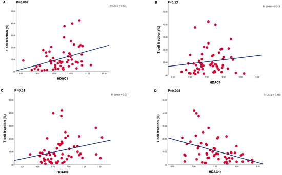 Correlations between mRNA expression levels (determined by Illumina array) of different HDACs and T cell fraction (%) (Determined by ddPCR) (n = 59). (A) HDAC1 R2 = 0.124, p = 0.002, (B) HDAC4 R2 = 0.019, p = 0.13, (C) HDAC8 R2 = 0.071, p = 0.01, (D) HDAC11 R2 = 0.160, p = 0.005.