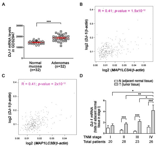DJ-1 is a neuroprotective and mitophagy protein against reactive oxygen species in Parkinson’s disease [36]. However, the role of DJ-1 in colorectal cancer remains elusive. First, we used the microarray data of the GSD2947 dataset to analyze DJ-1 mRNA levels in 32 pairs of adenoma tissues and normal mucosa tissues (≥2 cm from the side of the polyp), which were obtained from the same colon segment from 28 colorectal cancer patients. The microarray result shows that DJ-1 mRNA levels increased in 32 colorectal adenoma tissues than respectively paired normal mucosa tissues in the patients of the Belcolle City Hospital (Viterbo, Italy) (Figure 1A; p < 0.001). During autophagy/mitophagy activation, LC3A and LC3B are involved in the formation of autophagosomal vacuoles. MAP1LC3A and MAP1LC3B are protein-coding genes of LC3A and LC3B, respectively. The analysis results of GEPIA (Gene Expression Profiling Interactive Analysis) show DJ-1 mRNA expression was positively corrected with MAP1LC3A and MAP1LC3B expressions in tumor tissues of subjects with colon adenocarcinoma (R = 0.41 in both two; Figure 1B,C). It suggests that DJ-1 expression in colon adenocarcinoma might associate with autophagy/mitophagy. We then collected specimens and used real-time quantitative PCR to analyze DJ-1 mRNA expressions in 97 tissue pairs from Taiwanese patients with different TNM stages of colorectal cancer. In 20 paired adjacent normal tissues (N) and tumor tissues (T) obtained from 20 patients with TNM stage I colorectal cancer, DJ-1 did not significantly change between N and T (Figure 1D). In the tissue pairs from patients with TNM stage II (n = 28), III (n = 23), and IV (n = 26) colorectal cancer, DJ-1 significantly increased in T than N (Figure 1D). In addition, the increase of DJ-1 in T was TNM stage-dependently (Figure 1D). Our data indicate that DJ-1 mRNA overexpression in tumor tissues is positively correlated with TNM stages of colorectal cancer patients, and its function might associate with autophagy/mitophagy.