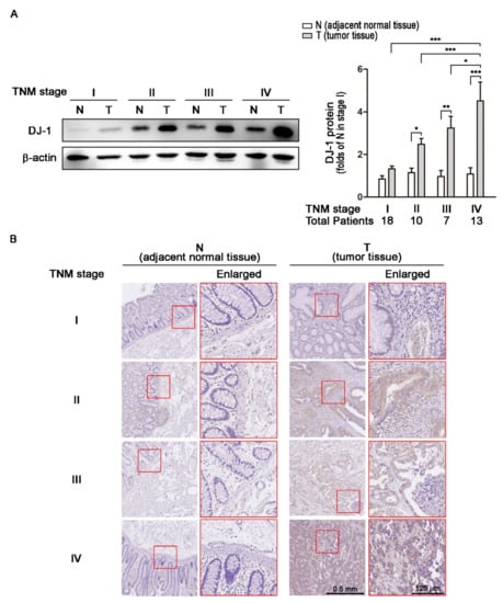 Transcription and RNA processing regulate mRNA expressions; translation and post-transcriptional regulation control protein expressions. Since DJ-1 mRNA overexpression in tumor tissues was positively correlated with TNM stages, we further analyzed DJ-1 protein levels. We used Western blot to analyze DJ-1 expressions in 48 tissue pairs from Taiwanese patients with different TNM stages of colorectal cancer. In 18 paired adjacent normal tissues (N) and tumor tissues (T) obtained from 18 patients with TNM stage I colorectal cancer, DJ-1 did not significantly change (Figure 2A). In TNM stage II (n = 10), III (n = 7), and IV (n = 13) colorectal cancer patients, DJ-1 significantly increased only in T but not N, and the increase of DJ-1 in T was TNM stage-dependent (Figure 2A). The quantification data of DJ-1 protein levels are shown on the right panel of Figure 2A. DJ-1 immunohistochemistry (IHC) data also show that DJ-1 staining increase only appeared in T but not N in each stage, and DJ-1 staining in T increased with TNM stages (Figure 2B). The enlarged images on the right panels are from the respective red squares of the left panels (Figure 2B). Our data suggest that DJ-1 protein overexpression appears in tumor tissues but not adjacent normal tissues, and DJ-1 protein overexpression in tumor tissues is positively correlated with TNM stages of colorectal cancer patients.
