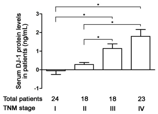 Serum DJ-1 is a diagnostic marker and prognostic factor for pancreatic cancer [30]. In 2020, Wang et al. used tissue microarray from patients to demonstrate DJ-1 expression in tumor tissues is a new prognostic marker in colorectal cancer [28]. Since our data of tumor tissues are consistent with Wang et al., we further analyzed the correction of serum DJ-1 levels and TNM stages of colorectal cancer in 83 Taiwanese patients. Our ELISA data show that serum DJ-1 levels in 24 patients with TNM stage I colorectal cancer were about zero (Figure 3). Serum DJ-1 levels in TNM stage II (n = 18), III (n = 18), and IV (n = 23) colorectal cancer patients showed TNM stage-dependently increase (Figure 3, p < 0.05). This indicates that serum DJ-1 levels in colorectal cancer patients are TNM stage-dependent, consistent with our data of DJ-1 mRNA and DJ-1 protein expressions in tumor tissues. Our data suggest that DJ-1 is a colorectal cancer biomarker. In addition, DJ-1 increase in both tumor tissues and serum is positively correlated with TNM stages of colorectal cancer.