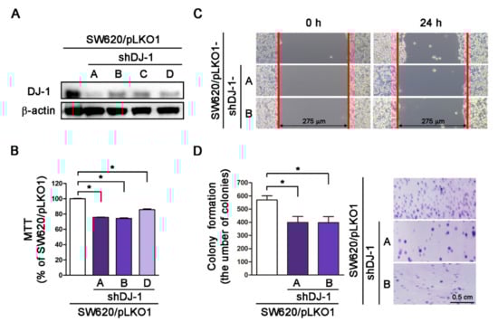 Our microarray data in Figure 1A shows DJ-1 increased in adenoma than normal mucosa tissues. Additionally, DJ-1 mRNA and DJ-1 protein increased in TNM stage II, III, and IV colorectal cancer tumor tissues but not TNM stage I. SW620 is a metastasis-derived human colorectal adenocarcinoma cell; SW620 shows higher tumorigenic and metastatic than SW480 cells [40]. Zhou et al. showed that DJ-1 increased more significantly in SW620 than SW480 cells [26]. We then transfected four vector-based DJ-1-specific short hairpin RNAs (pLKO1-shDJ-1-A, -B, -C, and -D) into SW620 cells and used puromycin to select DJ-1 stable knockdown cell clones. Western blot result of Figure 4A shows that the four pLKO1-shDJ-1 plasmids (pLKO1-shDJ-1-A, -B, -C, and -D) effectively reduced DJ-1 expressions in all four stable knockdown cell clones (SW620/pLKO1-shDJ-1-A, -B, -C, and -D) as compared with the empty vector-transfected control (SW620/pLKO1). We further evaluated cell viability, cell migration, and colony formation in DJ-1 knockdown cell clones. The cell viability data by MTT assay show that three DJ-1 knockdown cell clones (SW620/pLKO1-shDJ-1-A, -B, and -D) had lower cell viability than control (SW620/pLKO1) (Figure 4B, p < 0.05). Cell migration is a highly integrated, multi-step process that plays an essential role in cancer progression. Twenty-four hours after a standardized gap (275 μm) was created for cell migration between cells by 2-well cell insert, SW620/pLKO1-shDJ-1-A and -B showed slower cell migration than control (Figure 4C). The adhesion-independent cell proliferation data by colony formation show SW620/pLKO1-shDJ-1-A and -B were lower in colony numbers than control after 500 cells were seeded for 14 days (Figure 4D, p < 0.05). The images of the colonies stained with crystal violet are shown on the right panels of Figure 4D. These data indicate that DJ-1 knockdown inhibits cell viability, cell migration, and colony formation in metastatic colorectal adenocarcinoma cells.