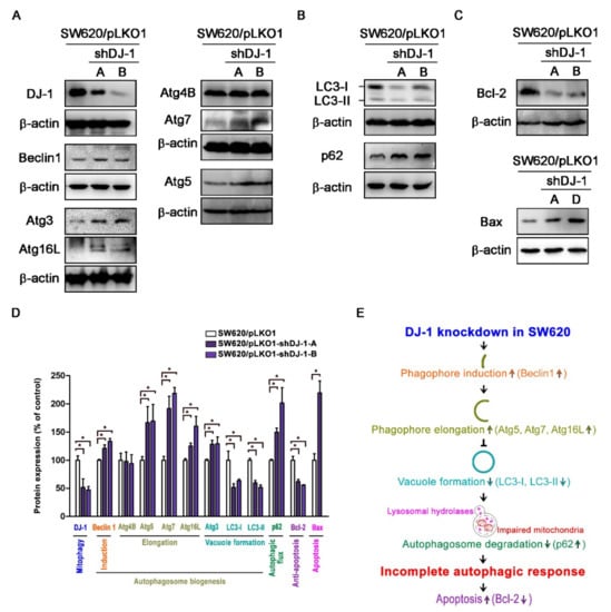 Our microarray data (Figure 1B,C) show DJ-1 mRNA expression was positively correlated with MAP1LC3A and MAP1LC3B expressions in tumor tissues from subjects with colon adenocarcinoma. It suggests that DJ-1 expression in colon adenocarcinoma might associate with autophagy/mitophagy. The process of autophagy includes autophagy induction, substrate recognition and selection, autophagosome biogenesis (phagophore nucleation/induction, phagophore elongation, substrate binding, and vacuole formation), autophagosome-lysosome fusion, and substrate degradation and recycling [6,7]. Since the function of DJ-1 might associate with autophagy/mitophagy, we analyzed autophagosome biogenesis in DJ-1 stable knockdown cells. Western blot data of Figure 5A show DJ-1 decreases in DJ-1 stable knockdown cell clones (SW620/pLKO1-shDJ-1-A and -B) more than control (SW620/pLKO1). DJ-1 knockdown cell clones (SW620/pLKO1-shDJ-1-A and -B) showed higher Beclin 1, Atg3, Atg5, Atg7, and Atg16L than control (Figure 5A). It suggests DJ-1 knockdown enhances phagophore induction (Beclin1 increased) and elongation (Atg5, Atg7, and Atg16L increased) during autophagosome biogenesis in metastatic colorectal adenocarcinoma cells. We found LC3 decreased and p62 increased in DJ-1 knockdown cell clones (SW620/pLKO1-shDJ-1-A and -B) compared with control (Figure 5B). It indicates that DJ-1 knockdown represses vacuole formation (LC3-I and LC3-II decreased) and autophagosome degradation (p62 increased) during autophagosome biogenesis. We also found Bcl-2 decreased and Bax increased in DJ-1 knockdown cells (SW620/pLKO1-shDJ-1-A, -B, or -D) compared with control (Figure 5C). Figure 5D is the quantification data of each protein level. Our data suggest that DJ-1 knockdown induced an incomplete autophagic response and cell apoptosis in metastatic colorectal adenocarcinoma cells. A proposed model of DJ-1 knockdown-induced incomplete autophagy is shown in Figure 5E.