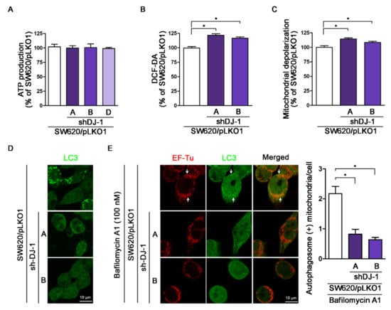 DJ-1 knockdown does not affect adenosine triphosphate (ATP) production; DJ-1 knockdown enhances intracellular reactive oxygen species (ROS) generation, damaged mitochondrial accumulation and mitophagy inhibition in metastatic colorectal adenocarcinoma cells. (A) The ATP production result shows that DJ-1 knockdown did not impact ATP production in three DJ-1 stable knockdown cell clones (SW620/pLKO1-shDJ-1-A, -B, and -D) as compared with control (SW620/pLKO1). (B) The DCF-DA assay result shows that DJ-1 knockdown cell clones (SW620/pLKO1-shDJ-1-A and -B) had higher intracellular ROS than control. (C) DJ-1 knockdown cell clones (SW620/pLKO1-shDJ-1-A and -B) showed increased mitochondrial depolarization than control. (D) For mitophagy analysis, we used anti-EF-Tu and anti-LC3 antibodies to stain mitochondria and autophagosomes, respectively. Images of LC3 immunofluorescence staining obtained from confocal microscopy show that control (SW620/pLKO1) cells contained more autophagosomes (LC3 punctate dots) than DJ-1 knockdown cell clones (SW620/pLKO1-shDJ-1-A and -B). (E) Images of immunofluorescence double staining obtained from confocal microscopy show mitochondria colocalized with autophagosomes in control (SW620/pLKO1). Arrows indicate the colocalizations of EF-Tu and LC3. DJ-1 knockdown cell clones (SW620/pLKO1-shDJ-1-A and -B) inhibited mitochondria colocalization with autophagosomes. These results indicate that DJ-1 knockdown does not influence mitochondrial ATP production but enhances intracellular ROS generation and damaged mitochondria accumulation and inhibits mitochondria colocalization with autophagosomes. The quantification data of autophagosome-positive mitochondria per cell are shown on the right panel. Data are expressed as the means ± S.E.M; the p-value was determined by one-way ANOVA/Newman–Keuls test. * p < 0.05 compared with the control group.