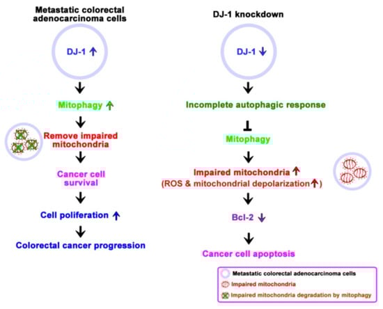 A proposed model shows the role of DJ-1 activates mitophagy to promote colorectal cancer progression. In metastatic colorectal adenocarcinoma cells SW620, DJ-1 activates mitophagy to remove dysfunctional mitochondria against tumor cell apoptosis. DJ-1 upregulation enhances cell survival and proliferation in metastatic colorectal adenocarcinoma cells, resulting in colorectal cancer progression. Inhibition of DJ-1 expression by DJ-1 knockdown induces an incomplete autophagic response and mitophagy inhibition that causes metastatic colorectal adenocarcinoma cells unable to remove damaged mitochondria and further induce cancer cell apoptosis.