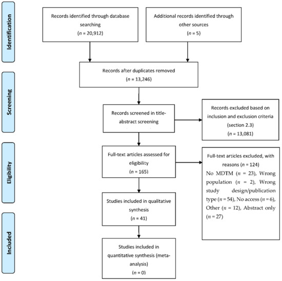 A total of 20,912 articles were retrieved from electronic database searches (Figure 1). After removal of duplicates, 13,246 studies were evaluated in the title–abstract screening. Following title-abstract screening, 165 full-text articles were assessed for eligibility, and 41 studies were included in the final analysis. The measured Cohen’s Kappa for the inter-observer agreement between reviewers was 0.656, indicating substantial agreement [16]. It was not necessary to consult a third reviewer during title–abstract and full-text screening, as no disagreements remained after discussion.