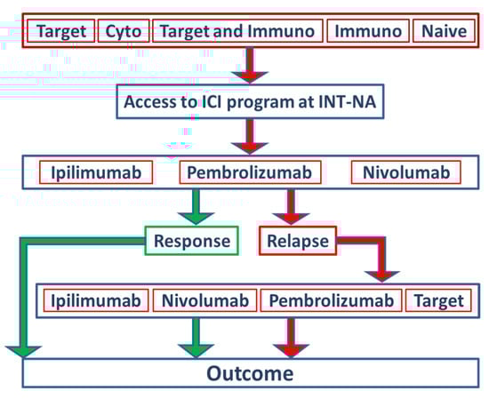 Anti-CTLA-4 (ipilimumab 51%) and anti-PD-1 (nivolumab 26%; pembrolizumab 23%) were defined as intervention variables for the ICI program. The distribution between females and males was equally balanced. Furthermore, patients were stratified into five groups based on the type of treatment they had received before they were included in the ICI program at the INT-NA (Figure 1, Table 1). A total of 34% percent of patients did not receive any therapy before inclusion (naïve), 25% received prior ICI treatments, 18% received prior target therapy (TT), 10% of patients received an ICI and TT, and 13% of patients were treated with cytostatic schedules. For further predictive and prognostic analyses, the types of pretreatment agents were dichotomized in no target and target subgroups.