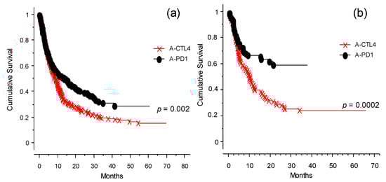 OS analysis for anti-CTLA-4- or anti-PD-1-treated patients (observation time >40 months): (a) OS analysis for the whole cohort of patients categorized by type of ICI received at INT-NA: anti-CTLA-4 (×--×) or anti-PD-1 (•--•), p = 0.002. (b) OS analysis of the naïve group selected for type of ICI received at INT-NA: anti-CTLA-4 (×--×) or anti-PD-1 (•--•), p = 0.0002.