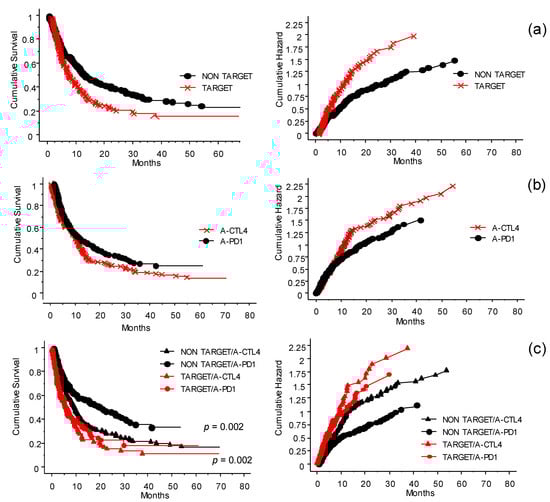 Interaction and significance of the treatments received before inclusion in the ICI program at the INT-NA: cumulative survival (left panels) and hazard plots (right panels). (a) The treatments before inclusion (see Figure 2b) have been simplified by grouping them into target (red line) or non-target (black line) groups. Patients who did not receive target treatment had more favorable outcomes (p < 0.0001). (b) In the cohort of patients who received prior TT, when exposed to anti-CTLA-4 (×) or anti-PD-1 (●) (i.e., naïve not included), interestingly, the effect of anti-PD-1 was not significantly different from that of anti-CTLA-4 (p = 0.07). (c) Significance of first-line treatment with target or non-target therapy on the outcome of the ICI program. In both anti-CTLA-4 (∆) and anti-PD1 (●) treatments, patients who did not receive previous target treatment had a more favorable outcome (p = 0.002).