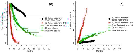 The probability of survival and chance of good response for patients without further treatment was significantly different (Figure 5, p = 0.0001) from other intervention strategies (treatments other than ICIs and TT after relapse, ICIs after relapse, TT after relapse, or no further treatment) (Figure 5). It is also important to note that the patients treated with other therapies after disease relapse had a clinical benefit compared to patients who were not treated after relapse. There is no evidence of differences between ICIs or other strategies of treatment after relapse. Thus, when possible, it is advantageous to invest in further treatments.