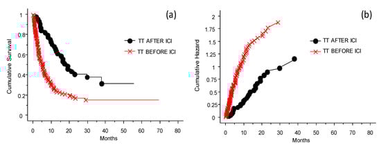 Probability of survival and risk for patients treated with TT before or after ICIs. Panel (a) shows probability of survival, panel (b) shows risk. The patients had different benefits depending on whether the treatment with TT was delivered before (worst OS, red line) or after (better OS, black line) the challenge with ICIs in case of disease progression (p < 0.0001).