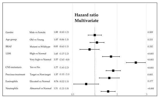 A total of 578 stage IV cutaneous melanoma patients (323 males, 255 females, median age 61.2) were included in the present study (Figure 1) (Table 1); 292 out of 578 patients (51%) received ipilimumab as monotherapy, 151 out of 578 patients (26%) received nivolumab as monotherapy, and 125 out of 578 patients (23%) received pembrolizumab as monotherapy. The clinical variables of the patients are presented in Table 1. The distribution is also specified for females and males. Additionally, the age had a cutoff at 65 years separating the group into younger and older, with a slightly higher representation among the patients aged 65 and over. In the male group, 58% were older patients compared to 42% of younger males, and the difference was not significant. For 548 patients (94.8%), the presence of BRAF mutation at the codon 600E was analyzed, while 30 patients were not tested for BRAF mutation. A total of 43% of patients had a detectable mutation in BRAF, with no statistical significance between sexes. CNS metastases were present in 28% of the cases included in the analysis, with an equal distribution between sexes. LDH values were grouped according to the local laboratory reference (LLR) interval: normal = 1× LLR; high > 1× < 2× LLR; very high > 2× LLR. The level of LDH was detected as very high in 14% of the cases, high in 20% of patients, and normal in 66% of the patients. Only 9% of patients had elevated eosinophils in their circulating blood. The NLR was abnormal in 45% of the patients. No difference between females and males was registered for these peripheral blood parameters.