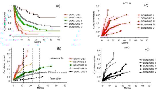 The CLICAL signatures and their interaction with the ICI treatments. Plot (a) shows the cumulative survival with the distribution of the patients grouped by their signatures. The five curves are significantly separated from one another (p = 0.001). (b) Cumulative risks for each signature easily show whether the characteristics of each signature are favorable or not. Plot (c) presents the effect of the signature when compared with anti-CTLA-4 treatment. The difference in prediction for the five signatures is significant (p = 0.0001). (d) Signatures IV and V predict a similar benefit to patients treated with anti-PD-1, and are different from Signature III as well as from I and II (p = 0.0001).