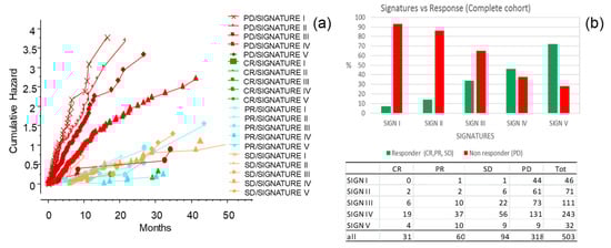 The CLICAL algorithm has the ability to distinguish response to ICI treatment of patients by their signature. The five signatures had different prediction rates for response (Figure 9a,b) (p = 0.001). Signature I had lower rates of response and, at the opposite end, the patients with Signature V had the highest percentage of response; the higher the signature, the better the odds of response. The cumulative hazard plot shows that patients not responsive to the therapy also have a higher risk to die earlier compared to patients responding to the therapy (Figure 9a). Interestingly, non-responding patients but with higher signatures (Signatures IV and V) have a better chance to survive compared to non-responding patients with lower signatures (Signatures I, II, and III) (Figure 9a). The group of patients with higher signatures (i.e., less and less risk), is composed of an increasing percentage of responsive patients and a decreasing percentage of non-responsive patients compared to the group of patients with lower signatures (Figure 9b). Of interest is the fact that patients who did not respond to the ICI treatment could still have a chance to live longer if they had a higher signature at inclusion; this could be due to the opportunity to receive subsequent treatment.