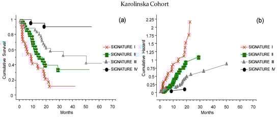 The CLICAL signatures obtained from the external cohort from Karolinska. Due to the restricted numbers, the cases could only be grouped in Signatures I–IV. (a) The plot shows the cumulative survival, with the distribution of the patients grouped by their signatures. The four curves are significantly separated from one another (p = 0.001). (b) The presentation of the cumulative risks for each signature easily shows that the CLICAL can determine the characteristics of each signature.
