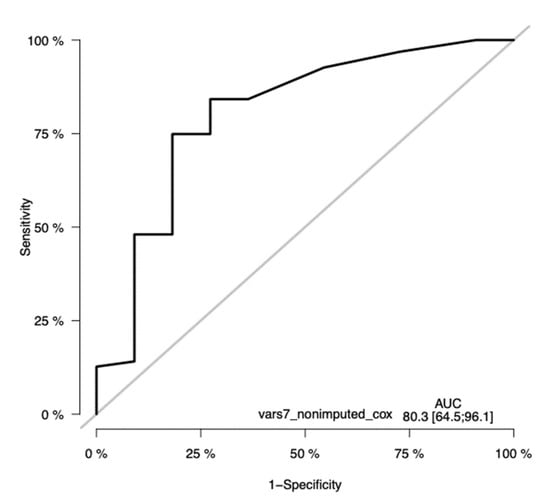 Time-dependent receiver operating characteristic (ROC) curves of the seven-variable Cox PH model at the timepoint of 36 months. The ROC has a significant sensitivity, with an AUC of 80.23(CI 64.5–96.1). The y-axis in the plot displays the true positive rate (TPR)—i.e., sensitivity—whereas the x-axis in the plot displays the false positive rate (FPR), i.e., specificity.