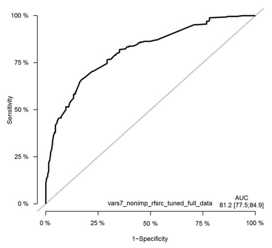 Survival random forest (SRF) models were created for predicting patient survival using the same seven clinical variables as the selected features for the models that were used for the Cox model. Optimized SRF models were generated by tuning model parameters and by using similar training—validation settings as for the Cox model, as well as using the full dataset. Due to the available sample size, the ROC curves were generated using the full dataset to obtain an adequate number of patients (Figure 12).