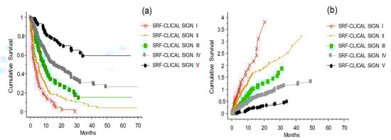 Kaplan–Meier survival curves of the melanoma patients divided into five risk groups based on their survival probability predictions obtained using the optimized survival random forest model. Plot (a) shows the cumulative survival with the distribution of the patients grouped by their signatures (applied to the risk groups defined by the SRF-CLICAL). The five curves are significantly separated from one another (p < 0.0001). (b) The presentation of the cumulative risks for each signature easily shows whether the characteristics of each signature are favorable or not.
