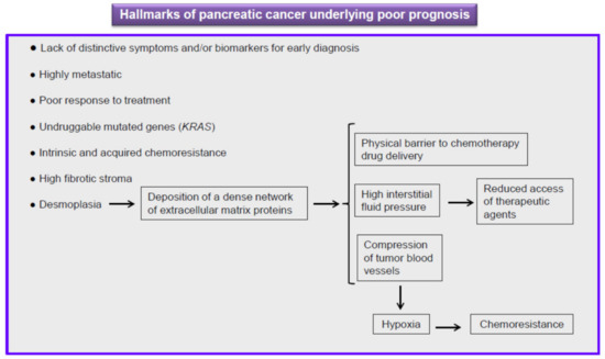 Pancreatic cancer is an intractable malignancy and, as stated above, PDAC (accounting for over 90% of all cases of pancreatic) remains an incurable cancer, with its 5-year survival remaining dismally poor at ~5–9% [19,34,48], and the 1-year survival rate at less than 20% [49]. Outcomes have not improved substantially over the past four decades, and patients with locally advanced disease have a median survival of 6–10 months, while for those with metastatic disease it is only 3–6 months [19,48]. Several reasons lead to this grim prognosis [19,50,51] (Figure 3): (a) the lack of visible and distinctive symptoms and reliable biomarkers for early diagnosis; (b) aggressive metastatic spread; (c) the proportion of patients (around 50%) who show metastatic disease at diagnosis; (d) poor response to treatment, showing intrinsic and acquired chemoresistance; (e) tumor heterogeneity and plasticity facilitating resistance to cancer therapy; and (f) the progression of disease being accompanied by accumulating genetic alterations and aberrations in signaling pathways that likely make the tumor more aggressive and drug resistant.