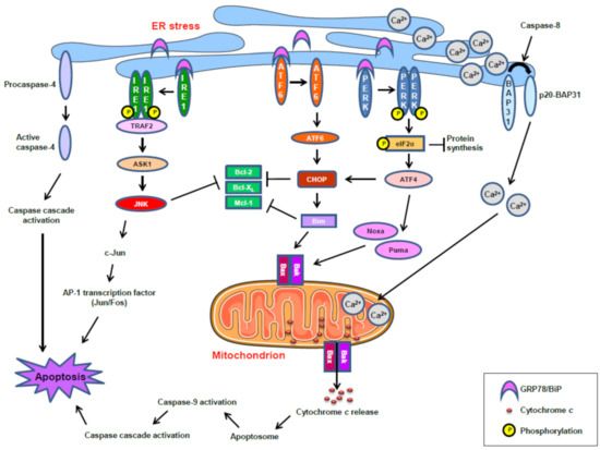 In addition, the integral protein of the ER B-cell receptor-associated protein 31 (BAP31) can be cleaved into the 20-kDa fragment p20-BAP31 following chronic ER stress [132], thus directing proapoptotic signals between the ER and mitochondria [140,141], and causing Ca2+ release from the ER, followed by Ca2+ entry into the mitochondria which, in turn, induces apoptosis [140,141]. On the other hand, caspase 4 has been shown to function as an ER-stress-specific caspase in humans [130,142].