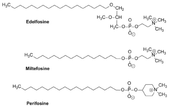 Taking into account that the timing and intensity of ER stress are critical factors in promoting survival or an apoptotic response, the selective induction of a persistent ER stress response in malignant cells, while normal cells are spared, could constitute a hypothetical promising approach in fighting pancreatic cancer. In this context, some members of a family of synthetic chemical compounds, collectively known as alkylphospholipid analogs (APLs), draw particular attention. APLs—also known as alkyl-lysophospholipid analogs (ALPs), antitumor ether lipids (AELs), or antitumor lipids (ATLs) [146,147,148,149,150]—were initially synthesized as metabolically stable analogs of 2-lysophosphatidylcholine [146]. These drugs have been shown to elicit important pharmacological activities against several diseases, including leishmaniasis—particularly miltefosine (hexadecylphosphocholine) (Figure 5) [148,151,152,153,154]—and cancer—particularly perifosine (Figure 5) (octadecyl-[1,1-dimethyl-piperidino-4-yl]phosphate) in clinical trials for hematological [148,155,156,157,158,159,160] and solid tumors [148,161,162,163,164,165,166,167]. A number of APLs have shown interesting biomedical activities, and are promising drugs in the treatment of different diseases in the clinic [148]. Miltefosine, representing the minimal structural requirement for the antitumor activity of APLs, has become the first oral drug to treat visceral and cutaneous leishmaniasis [152,154,168], marketed under the trade name of Impavido [148]. Miltefosine has also been approved to be used in the clinic as a topical drug, marketed under the trade name of Miltex (6% miltefosine solution), for the palliative treatment of cutaneous metastases from breast cancer [148,169].