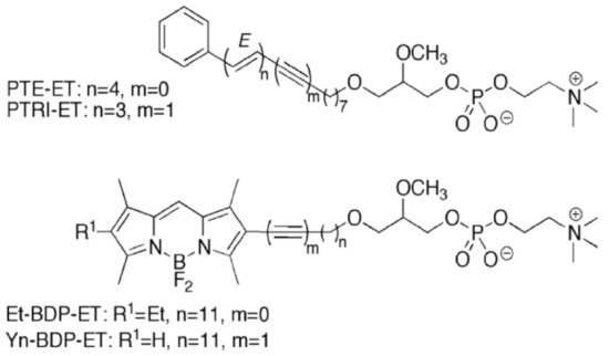 Unlike the above stimuli and anticancer drugs, edelfosine is selectively taken by tumor cells [184,185], and rapidly accumulates in the ER—especially in solid tumor cells—leading to persistent ER stress and, eventually, to apoptosis [132,135,201]. In order to visualize the subcellular localization of edelfosine, we used different newly synthesized fluorescent edelfosine analogs, including the first fluorescent edelfosine analog all-(E)-1-O-(15′-phenylpentadeca-8′,10′,12′,14′-tetraenyl)-2-O-methyl-rac-glycero-3-phosphocholine (PTE-ET) [184,207], its variant PTRI-ET, and the second generation of fluorescent edelfosine analogs that contained BODIPY (4,4-difluoro-4-bora-3a,4a-diaza-s-indacene; boron-dipyrromethene) [208,209], as a very potent fluorescent label incorporated into the alkyl chain of edelfosine, leading to the edelfosine analogs 1-O-[11′-(6”-ethyl-1”,3”,5”,7”-tetramethyl-4”,4”-difluoro-4”-bora-3a”,4a”-diaza-s-indacen-2”-yl)undecyl)]-2-O-methyl-rac-glycero-3-phosphocholine (Et-BDP-ET) and 1-O-[13′-(1”,3”,5”,7”-tetramethyl-4”,4”-difluoro-4”-bora-3a”,4a”-diaza-s-indacen-2”-yl)tridec-12′-ynyl]-2-O-methyl-rac-glycero-3-phosphocholine (Yn-BDP-ET) [210] (Figure 6).