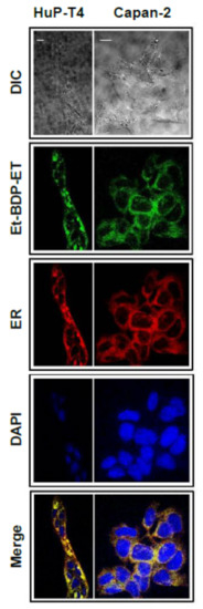 Using the BODIPY fluorescent edelfosine analog Et-BDP-ET [210], we found that this BODIPY-conjugated fluorescent derivative accumulated in the ER of HuP-T4 and Capan-2 human pancreatic cancer cells [132] (Figure 7). This ER localization of the BODIPY fluorescent edelfosine analog was also found in Ewing’s sarcoma cells [135], and the fluorescent PTE-ET edelfosine analog mainly accumulated in the ER of human cervical carcinoma HeLa cells, non-small-cell lung cancer A549 cells, and glioblastoma cells [201], as assessed using a version of a red fluorescent protein (RFP) targeting the ER that colocalized with the ER marker calreticulin [211].