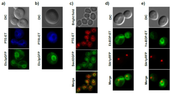 In an attempt to unveil the molecular mechanism of the antitumor ether lipid edelfosine, we used the budding yeast Saccharomyces cerevisiae—which is sensitive to the cytotoxic action of edelfosine [197,199,200,212]—as an experimental eukaryotic model organism [213]. We found that different fluorescent edelfosine analogs (PTE-ET, PTRI-ET, Et-BDP-ET, and Yn-BDP-ET) (Figure 6) yielded a similar localization pattern in yeast (Figure 8) [200]. This pattern of fluorescent edelfosine consisted of a bag-like envelope surrounding the nucleus (identified by the nucleolus marker Sik1p tagged with RFP), which resembled the morphological traits of the ER (Figure 8) [200]. In fact, we found an excellent colocalization between fluorescent edelfosine and the ER, as assessed by using Elo3p-GFP or Sec63pGFP as ER markers (Figure 8) [200]. No colocalization was detected between fluorescent edelfosine and other subcellular organelles or compartments, such as the Golgi, spindle pole, endosomes, cytoskeleton, peroxisomes, and lipid droplets [200]. Quantification of the subcellular localization of fluorescent edelfosine in S. cerevisiae showed that most of the antitumor ether lipid accumulated in the ER, albeit an additional localization was found in the yeast [200]. Interestingly, edelfosine binds to lipid rafts in both human cells [180,181,184,188] and yeast [199,200]. As a matter of fact, edelfosine was mainly found in the ER after 3 h of incubation with S. cerevisiae, but a significant amount of the antitumor drug was also found in lipid rafts, as determined after sucrose gradient raft isolation [199,200], which could suggest the presence of lipid rafts in the ER [200]. On the other hand, the ER localization of edelfosine in yeast did not depend on endocytosis, as PTE-ET could still be detected in endocytosis-defective end4pep4Δ mutants [200]. Thus, it is tempting to envisage the existence of traffic between the plasma membrane and the ER through lipid rafts. In this regard, it is worth remembering that the ER is a large intracellular organelle extending from the nuclear envelope to the cell membrane.