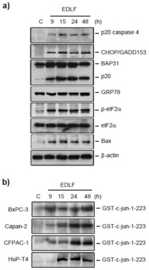 Edelfosine induces ER stress in human pancreatic cancer cells. (a) HuP-T4 cells, untreated (C) or treated with 20 μM edelfosine (EDLF) for the indicated times, were analyzed via Western blot using specific antibodies for the indicated proteins and ER stress markers; β-actin was used as a loading control. (b) The indicated pancreatic cancer cells, untreated (C) or treated with 20 μM edelfosine (EDLF) for the indicated times, were analyzed for JNK activation, as assessed by a solid-phase JNK assay using GST-c-Jun-1-123 as a substrate. See text for details. Images taken from [132].
