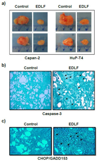 Further support for the involvement of the ER stress in the proapoptotic action of edelfosine in tumor cells derives from in vivo data of pancreatic cancer xenograft models. Oral administration of edelfosine (30 mg/kg of body weight) drastically reduced the size of pancreatic tumors generated by inoculation of Capan-2 or HuP-T4 human pancreatic tumor cells in CB17 severe combined immunodeficient (SCID) mice [132] (Figure 10). Tumors isolated from the xenograft mouse models with SCID mice, orally treated with edelfosine, showed a dramatic increase in apoptotic markers as well as in CHOP/GADD153 staining following immunohistochemical analyses [132] (Figure 10). These data, involving ER stress in the antitumor action of edelfosine, are also reproducible in other tumors, such as in Ewing’s sarcoma [135].