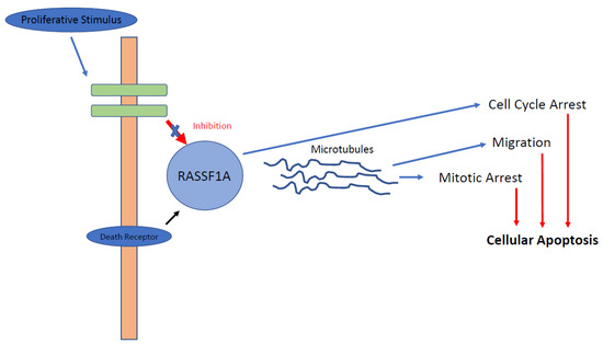 RASSF1A pathway. RASSF1A is affected positively by activation of the death receptor and affected negatively by proliferative stimuli, as demonstrated in GEP-NETs. Following activation of RASSF1A, binding to microtubule-binding proteins occurs, causing reduction in cellular migration, cell cycle arrest and, ultimately, apoptosis.