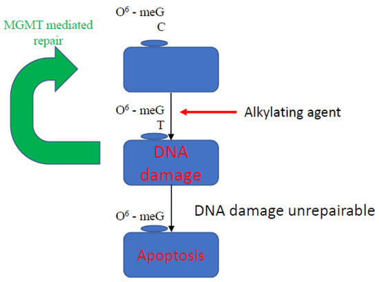 Mechanism of action of MGMT. O6-meG is removed by MGMT from 06-alkylguanine DNA. MGMT is inactivated and subject to ubiquitin degradation once the methyl group from the 06-meG is received. The 06-meGT is recognised by the mismatch repair pathway; subsequently, DNA double strands remain broken, and the cell undergoes apoptosis.