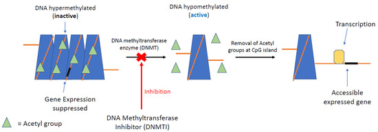 DNA promoter methylation is one of the most well-recognised epigenetic modifications in both normal and cancer cells. The methylation of cytosine to 5-methylcytosine is so integral to genomic homeostasis that this is often referred to as the ‘fifth base’ of the genome [6]. Methylation typically occurs within the CpG (or CpG dinucleotides) island via the action of DNA methyltransferase enzymes (DNMT) [7,8,9]. There are three main families of DNMT enzymes: DNMT1 maintains methylation, while DNMT3 consists of two related gene products (DNMT3a and DNMT3b) which are responsible for de novo methylation. The function of DNMT2 has not yet been fully elucidated. CpG islands are commonly found in the upstream promoter region of genes and are responsible for recruiting inhibitory protein complexes leading to transcriptional repression of the downstream gene. Methylation affects chromatin structure at high CpG-density sites, either by recruiting inhibitory protein complexes or by inhibiting the binding of transcription factors, resulting in transcriptional repression of downstream genes [10,11]. Conversely, in general, when promoter regions are hypomethylated, downstream genes are expressed [12]. DNA methylation also has an essential function in maintaining genome stability; if global hypomethylation occurs, the genome may become unstable [13]. Of particular note in tumorigenesis, global hypomethylation may co-exist with gene-specific hypermethylation, suggesting a degree of coordination in this dysregulation [13].