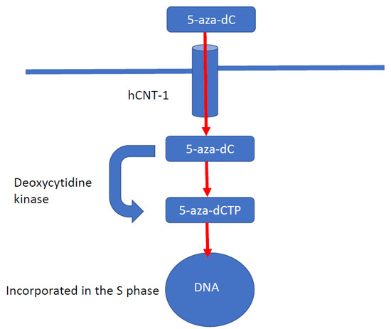 Mechanism of action of decitabine. Decitabine is a cytidine analogue modified in position 5 of the pyrimidine ring. Decitabine is transported into cells by human concentrative nucleoside transporter-1 (hCNT-1). Decitabine is converted by deoxycytidine kinase into its active form, 5-aza-2′-deoxycytidine-5′-triphosphate. Decitabine is a deoxyribose analogue and is incorporated only into DNA strands during the S phase of the cell cycle. The incorporated 5-azanucleoside disrupts the interaction between DNA and DNMTs and promotes proteosomal degradation of DNMT. This causes downstream inhibition of DNA methylation in subsequent daughter cells.